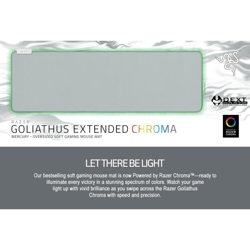 Razer goliathus extended chroma soft gaming mouse mat with chroma mercury rz02 02500314 r3m1 1y gamepro shop at a glance powered by razer chroma balanced for speed and control playstyles optimized surface for all mice and sensors inter device color synchronization tech specs powered by razer chroma lighting with 16 8 million customizable color options micro textured surface.